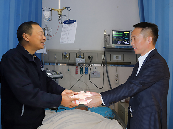 工会主席代表公司总部全体人员以及公司所有在建项目一线工人把捐助的爱心善款,亲自送去医院交到柯友明的手上,并代表肖总及全公司员工再次对崔业荣进行慰问与关心,安慰和鼓励柯友明全家人要积极配合好医生,尽心治疗,祝愿崔业荣能早日恢复,健康生活。